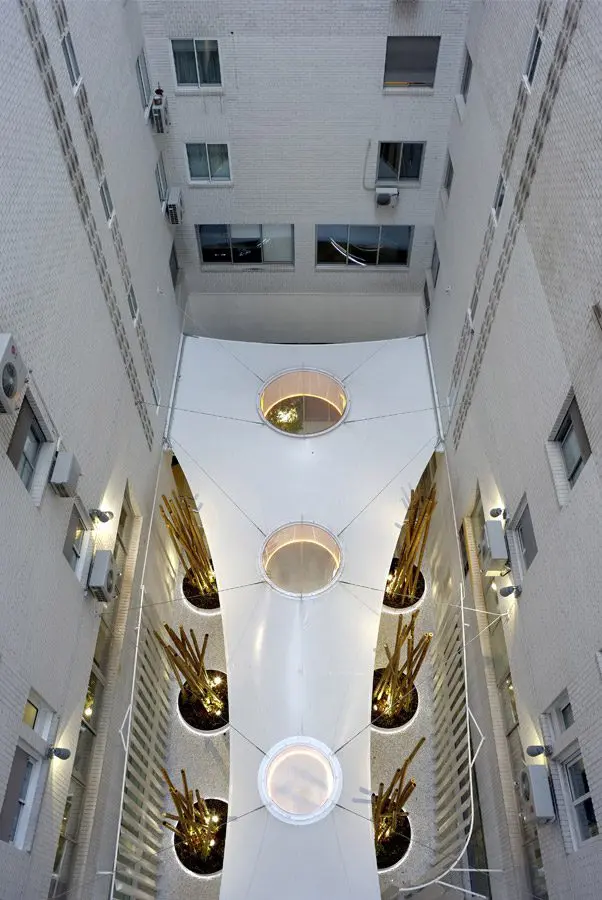 De otro lado se ha querido proteger de la lluvia a los inquilinos que crucen el patio, lo que se ha resuelto mediante una arquitectura textil tensada, suspendida y con tres lucernarios acristalados. Además de evitar la lluvia también evita la visión del patio con los compresores colgados y posible ropa tendida.