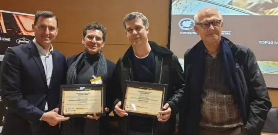 Fotografía de Héctor Coronel Director Comercial Hotel Pestana Plaza Mayor y Carlos Hernández-Carrillo Arquitecto Estudio b76 con el premio TS Media al Top 10 como mejor proyecto de sostenibilidad y rehabilitación hotelera construido en 2019 por el hotel Pestana Plaza Mayor.