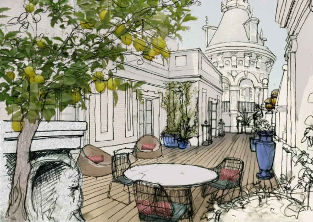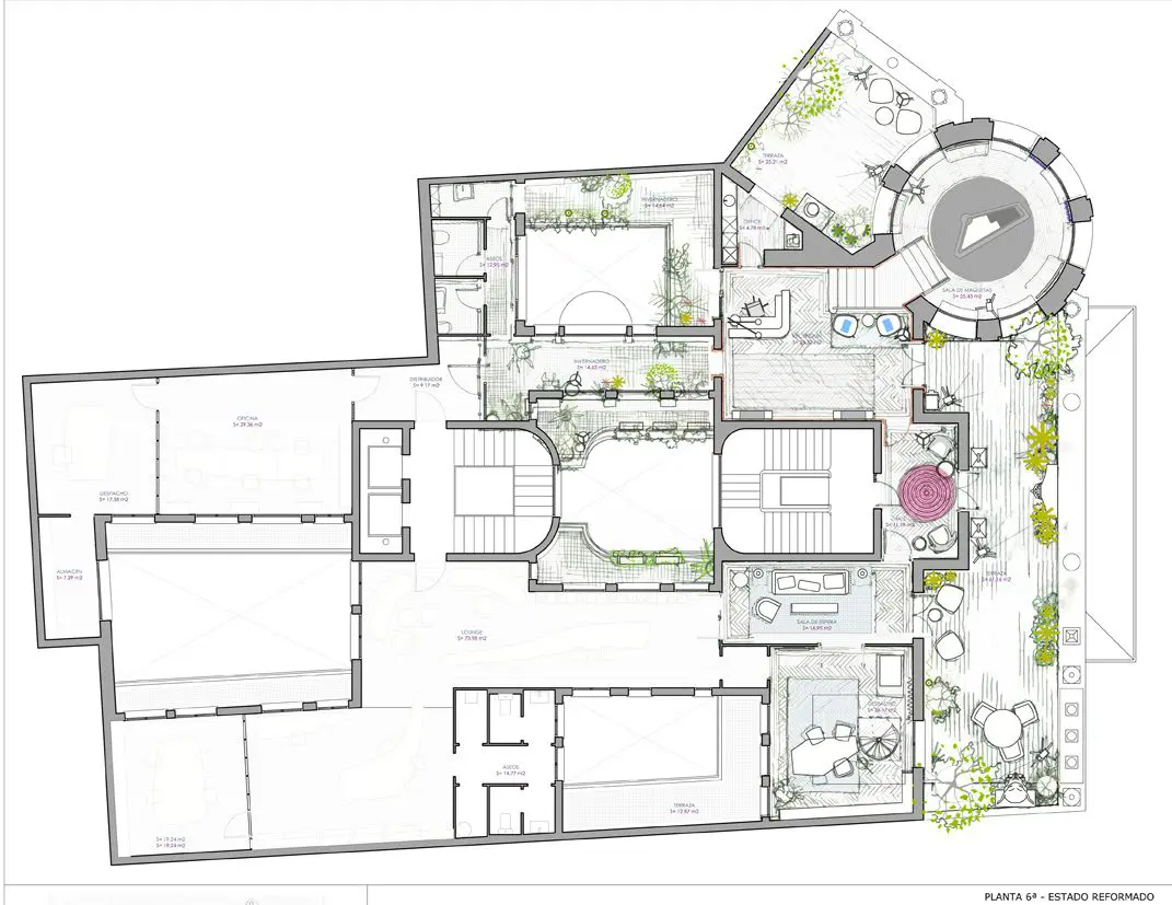 A la derecha, una escalera de 10 peldaños nos lleva al torreón, que alberga la “sala de maquetas”; a la izquierda, un hueco da paso a la zona del “invernadero”: un amplio pasillo acristalado a ambos lados desde donde podemos ver las terrazas también ajardinadas de ambos patios, todo ello repleto de plantas y que comunica con los aseos, que también podrán ser utilizados por los clientes. El suelo de esta zona se construirá con baldosa hidráulica con acabado similar al de las terrazas de los patios; las paredes irán revestidas con papel vinílico imitando textil natural. Finalmente, nos encontramos con la salida a la terraza exterior, más amplia.