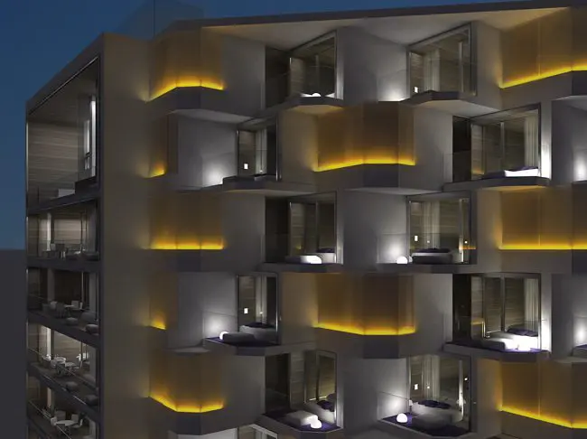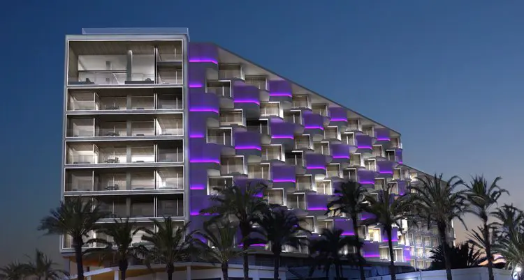 Un sistema de led RGB incorporado a la fachada, genera una impactante imagen nocturna, convirtiendo a este edificio en un auténtico faro que colaborará en seguir situando esta zona de Ibiza en el panorama turístico internacional de calidad.