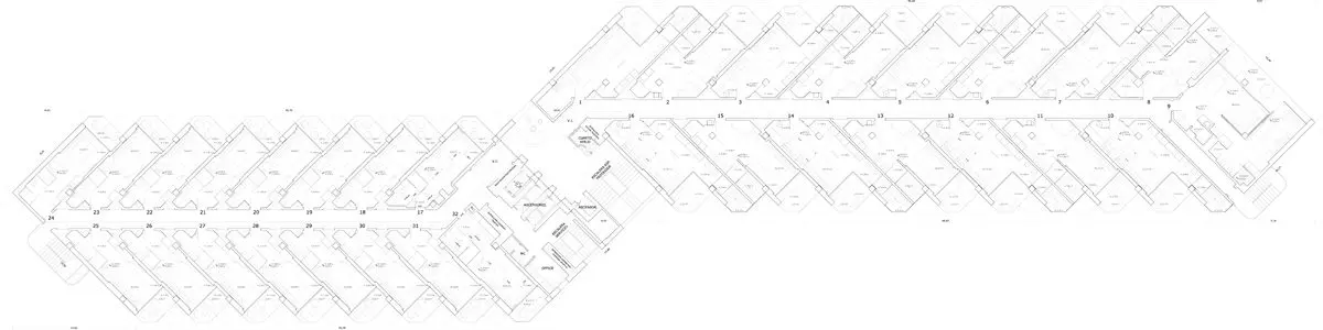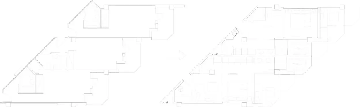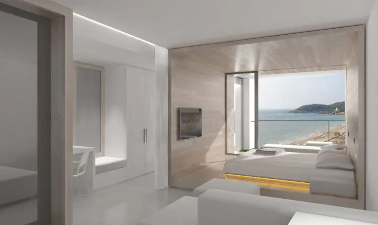 La mayor virtud y a la vez dificultad del proyecto de reforma de la Torre, fue su peculiar distribución en espina de pez, que permite una perfecta visión de la playa y del mar. Fue precisamente la solución aportada para sus habitaciones y el efecto que produce en la fachada del edificio con más visibilidad de toda Ibiza, lo que mereció la confianza de los promotores en la propuesta de Estudio b76.