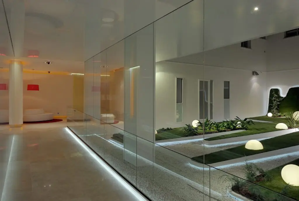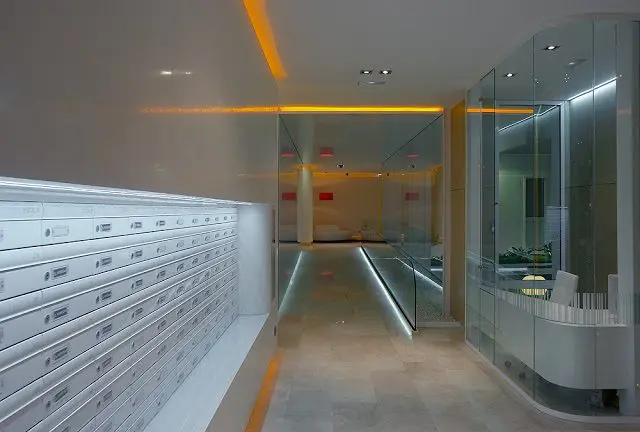 Por todo ello, los 340 m2 rehabilitados proporcionan amplitud, con un espacio diáfano, demoliendo divisiones y tabiques innecesarios e incorporando visualmente el patio; claridad, por el empleo de materiales con acabados claros y luminosos y por la incorporación de luz natural del patio al portal y portería, así como por el tratamiento de la iluminación artificial, indirecta y muy estudiada; calidad, por los materiales empleados como el mármol, estucos, panelados de madera, pan de oro y por la composición y proporción en su utilización. Y, finalmente, potenciando su imagen corporativa, siguiendo la ya proyectada y construida para su edificio en Capitán Haya 19.