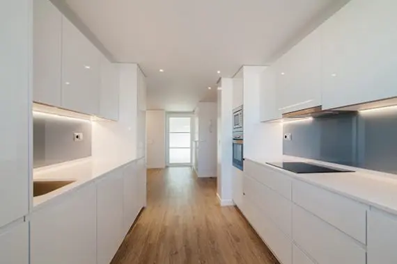 El mobiliario de cocina, modelo Escorial de Dismuco con los tiradores ocultos en los cantos y los electrodomésticos Balay integrados, se combina a la perfección con la encimera Silestone blanco Zeus, de Consentino.