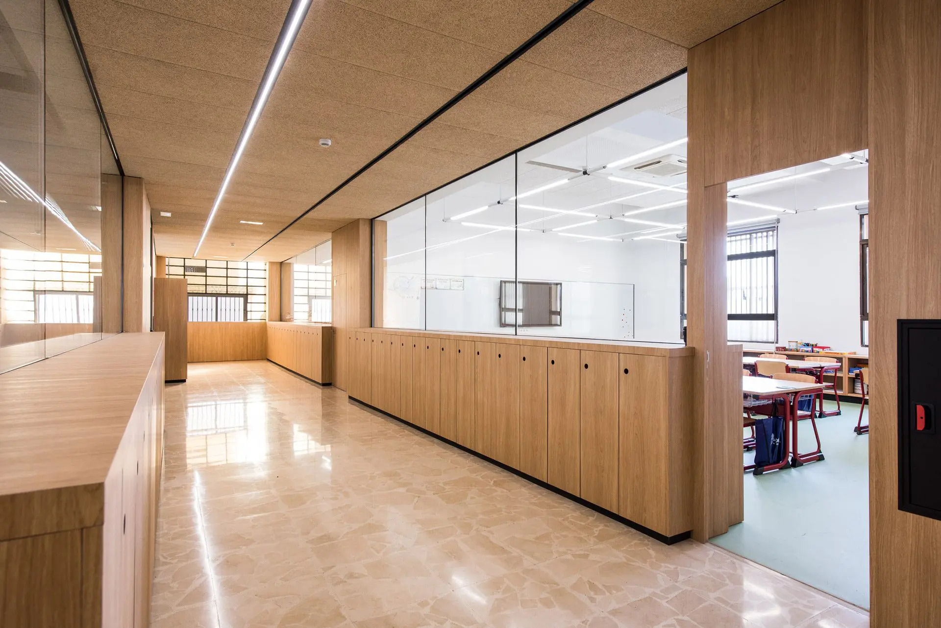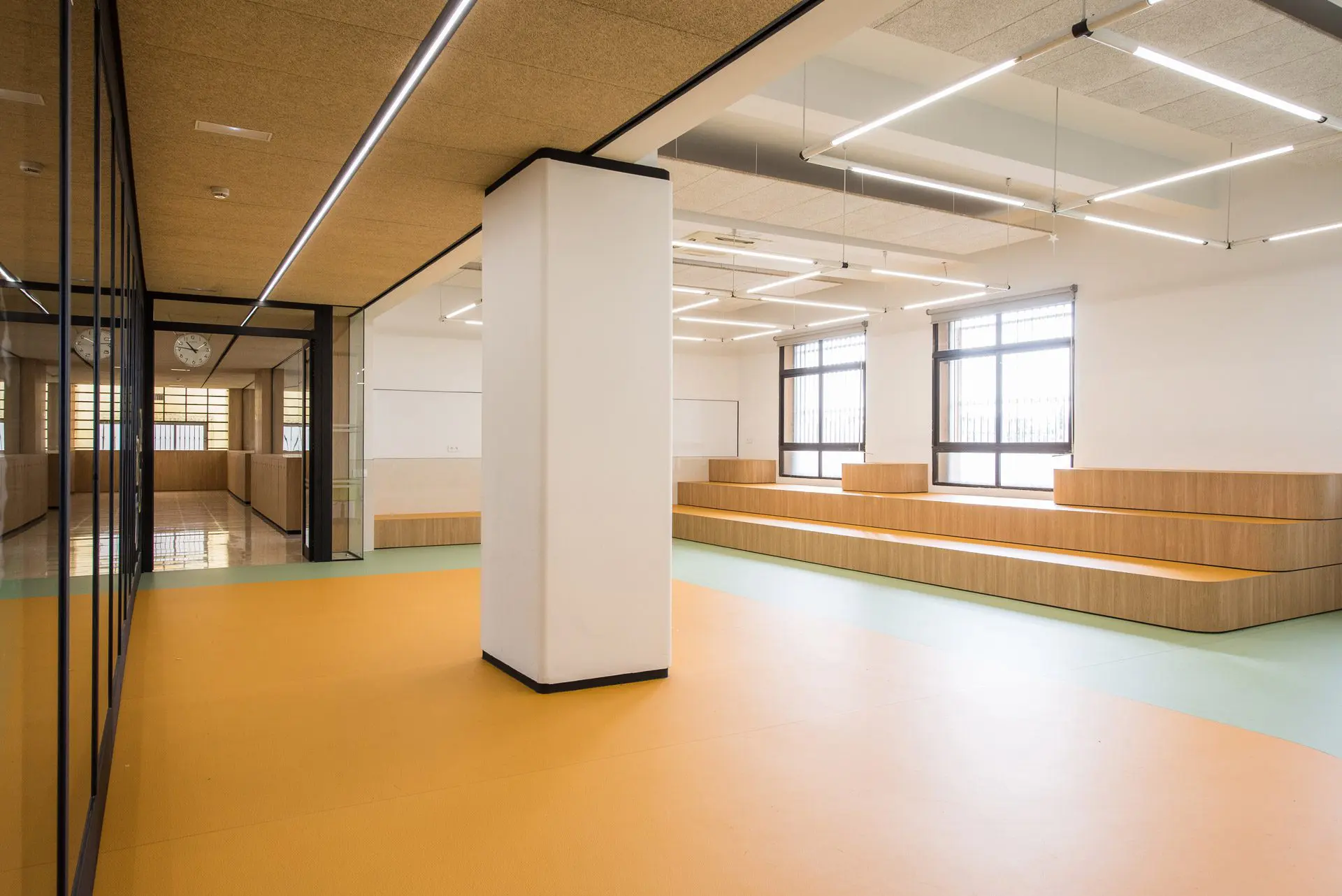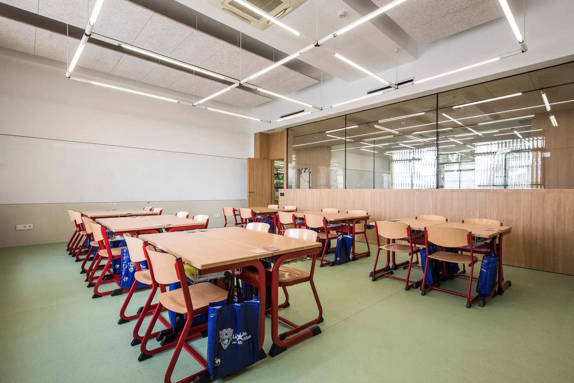 Hemos roto la rigidez de las aulas creando espacios comunicativos, que flexibilizan las relaciones alumno/profesor y entre los propios alumnos. Estos nuevos espacios proyectados que combinan los especializados en materias con los más flexibles y diáfanos, añaden a la calidad tecnológica del aula (digitalización, depuración del aire, ventilación, soleamiento etc.) las diferentes posibilidades de organización a disposición de quien imparte la materia según las necesidades.