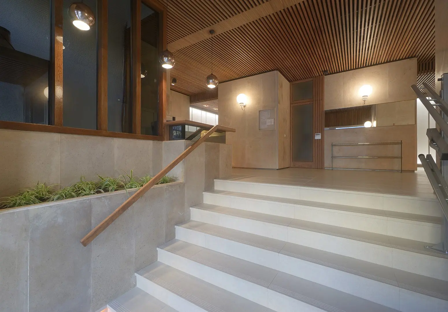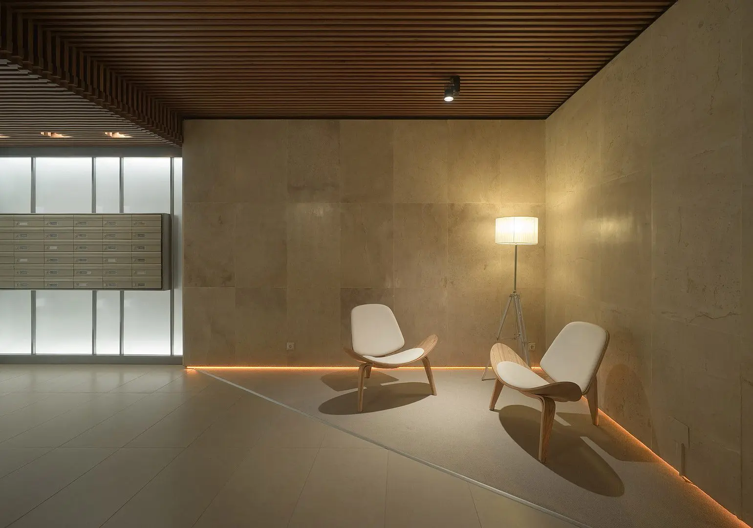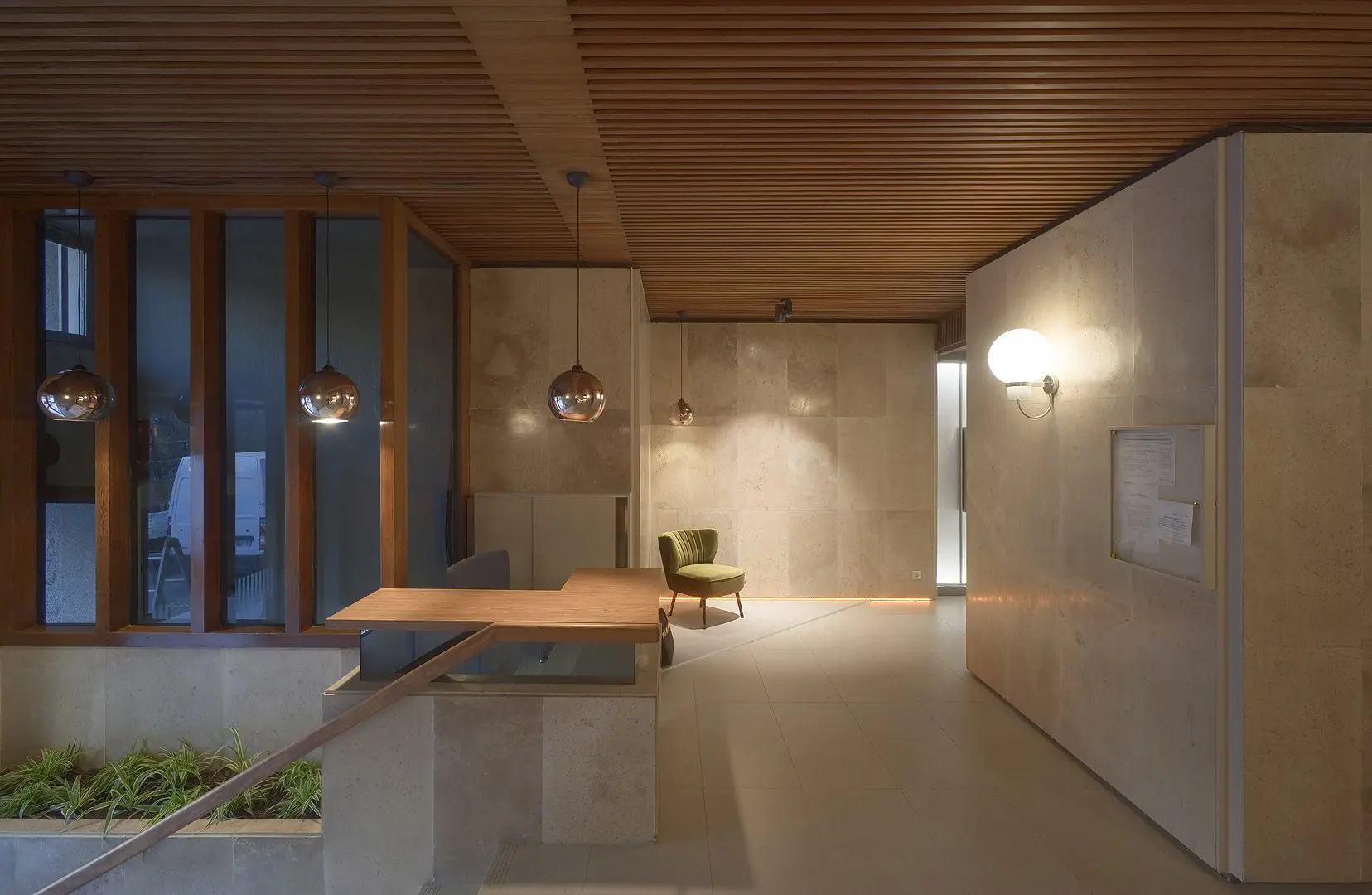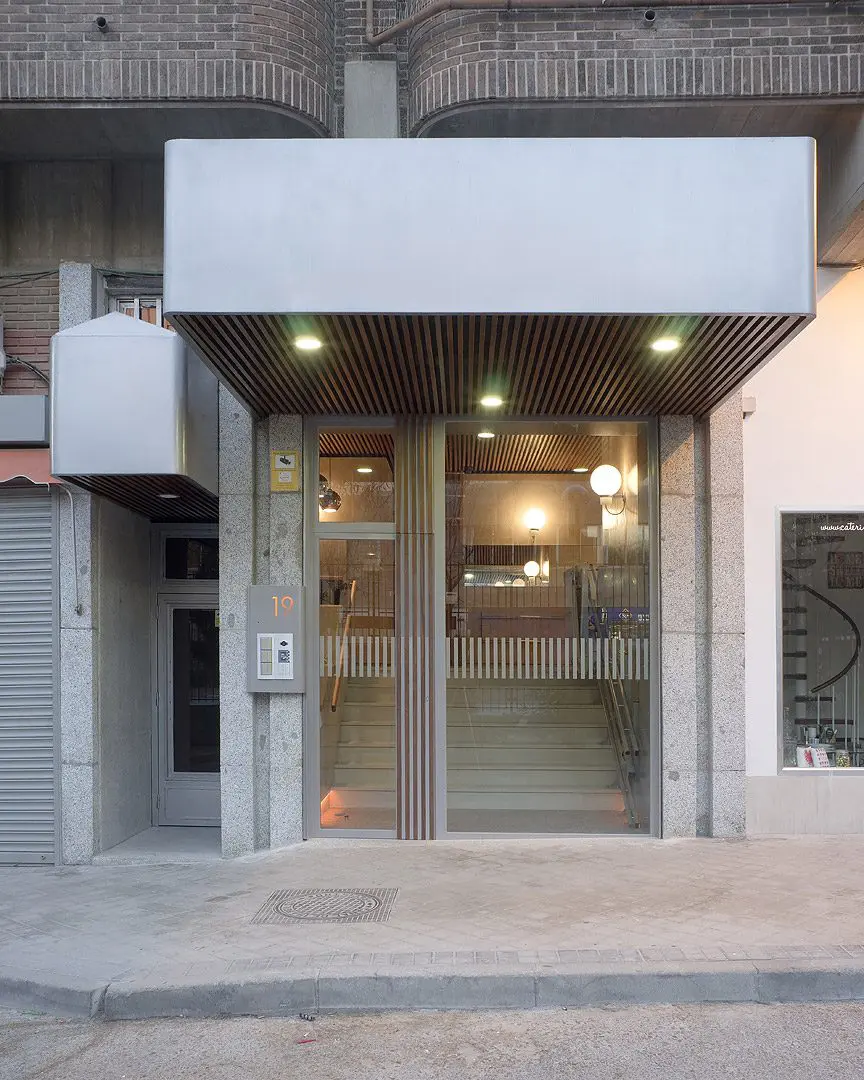 Estudio b76 procedió con la reforma de un portal en la avenida de Brasil, 19, respetando los valores de diseño originales y eliminando las afecciones negativas del paso del tiempo, una nueva iluminación, revestimientos cálidos y nuevo mobiliario hicieron el resto.