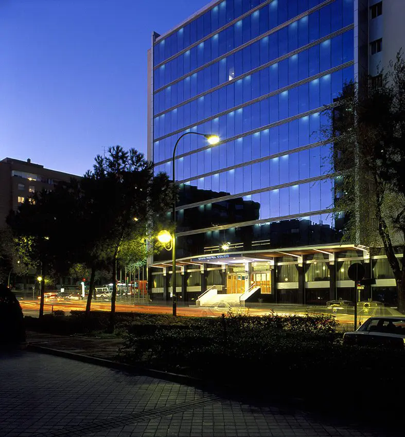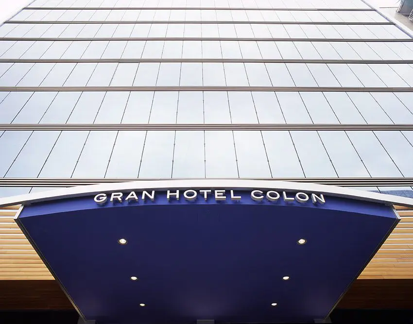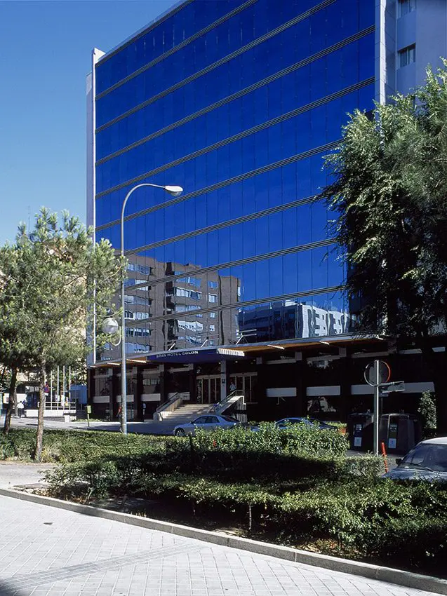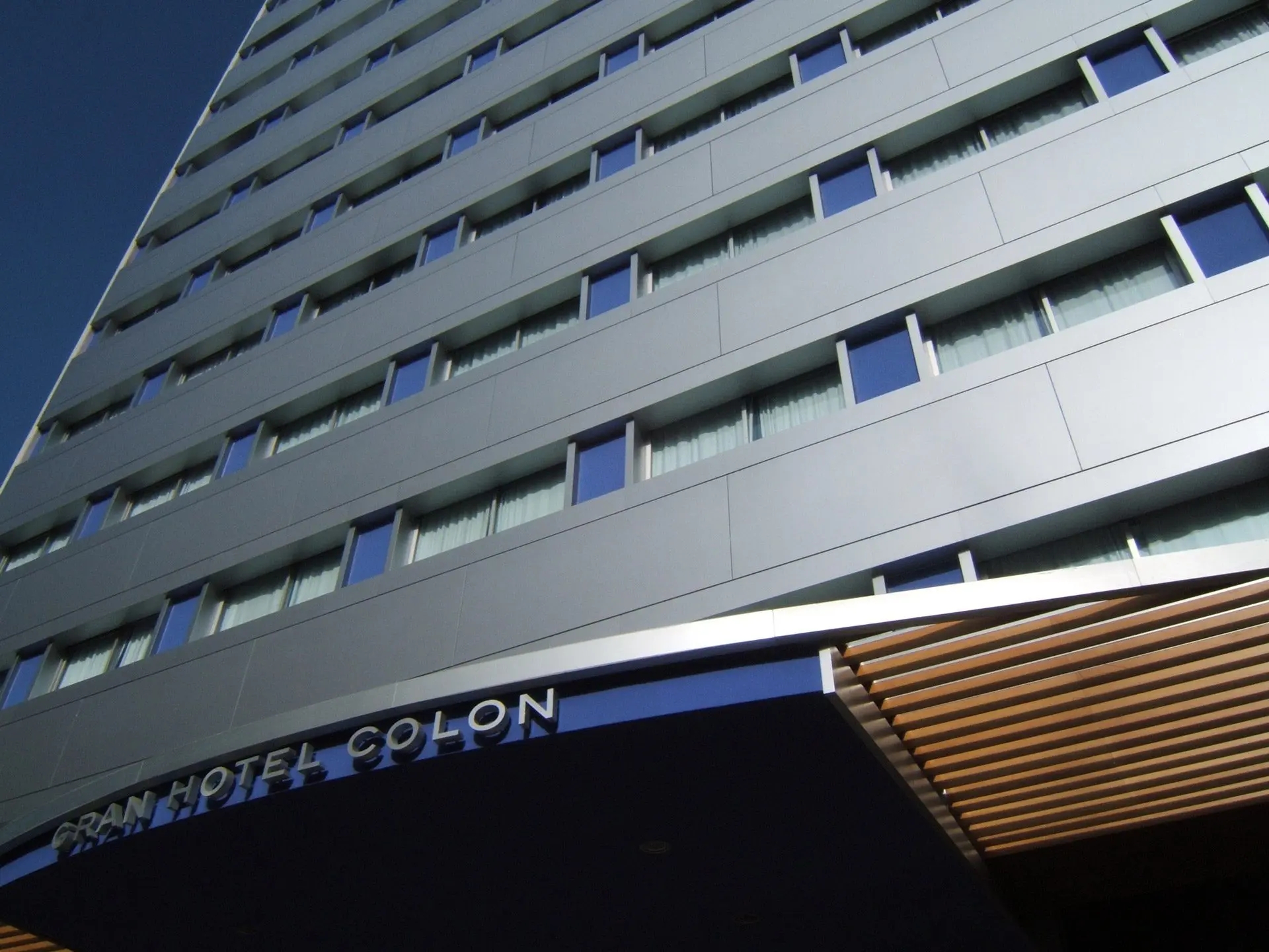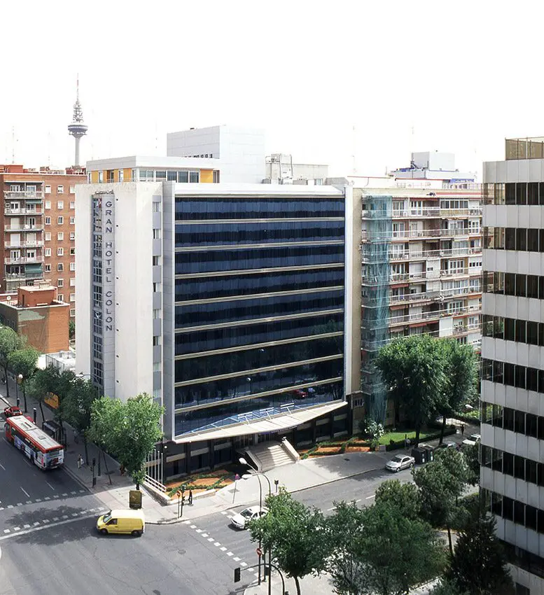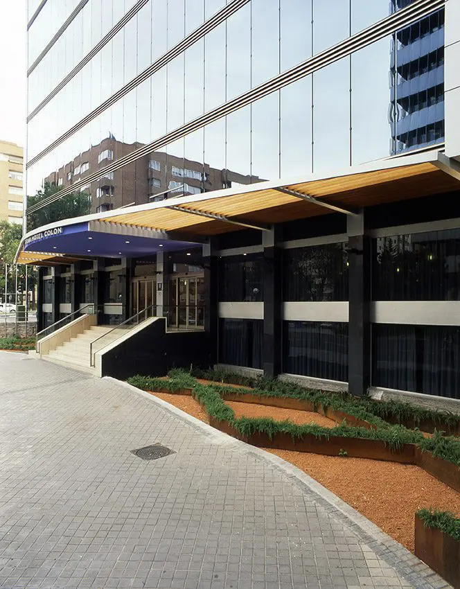 La propuesta consiste en fabricar “un traje nuevo” de aluminio y vidrio para actualizar la imagen de un edificio cuyas fachadas construidas en 1965 están en un mal estado de conservación. Las dos torres, Europa y América del Gran Hotel Colón de Madrid, de 12 y 14 plantas respectivamente son revestidas íntegramente, destacando el muro cortina de la fachada principal de la torre Europa. Los accesos de ambas torres se enmarcan con sendas marquesinas de 25 m2 de longitud y 5 m de vuelo, en acero y madera.