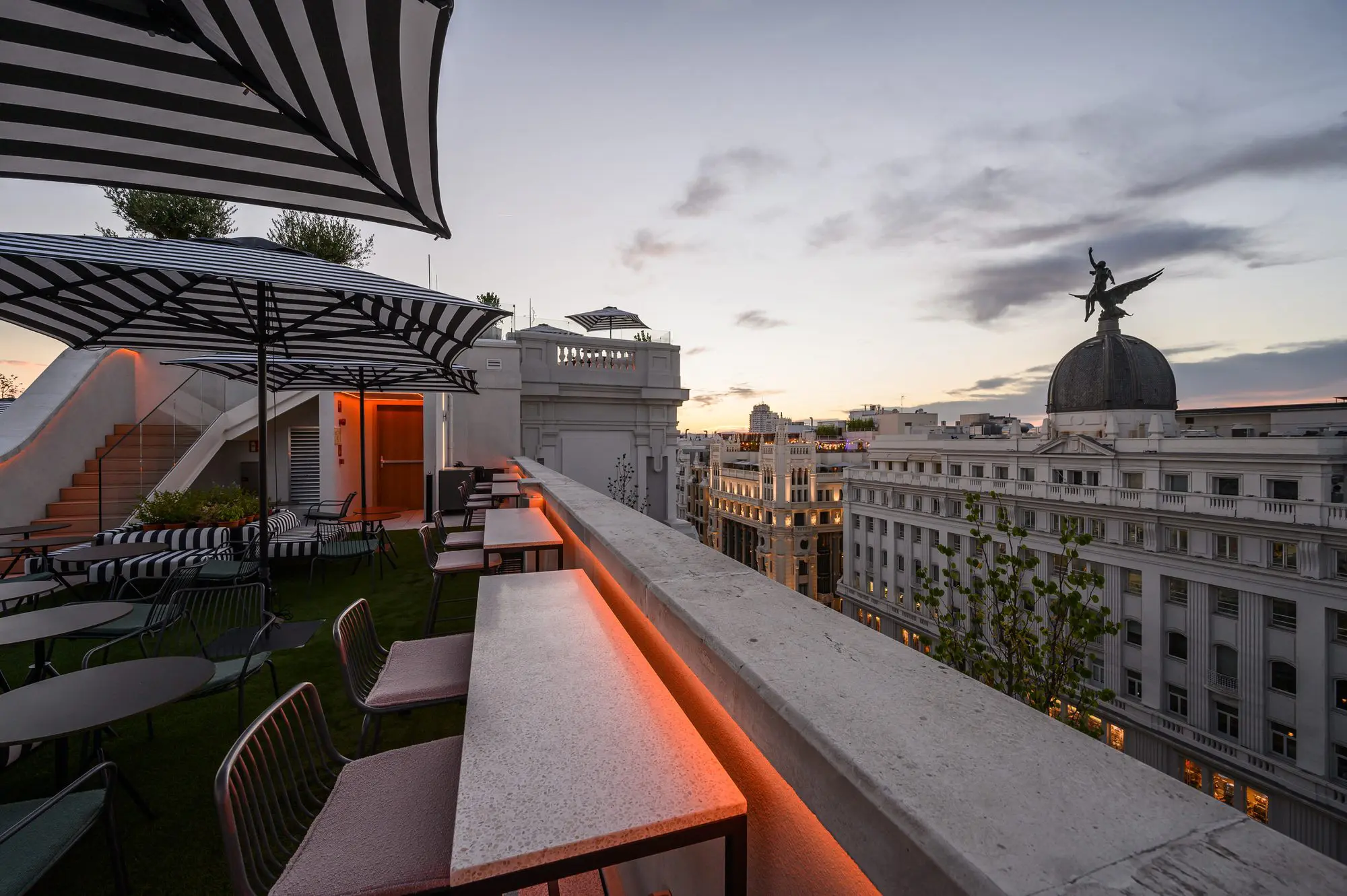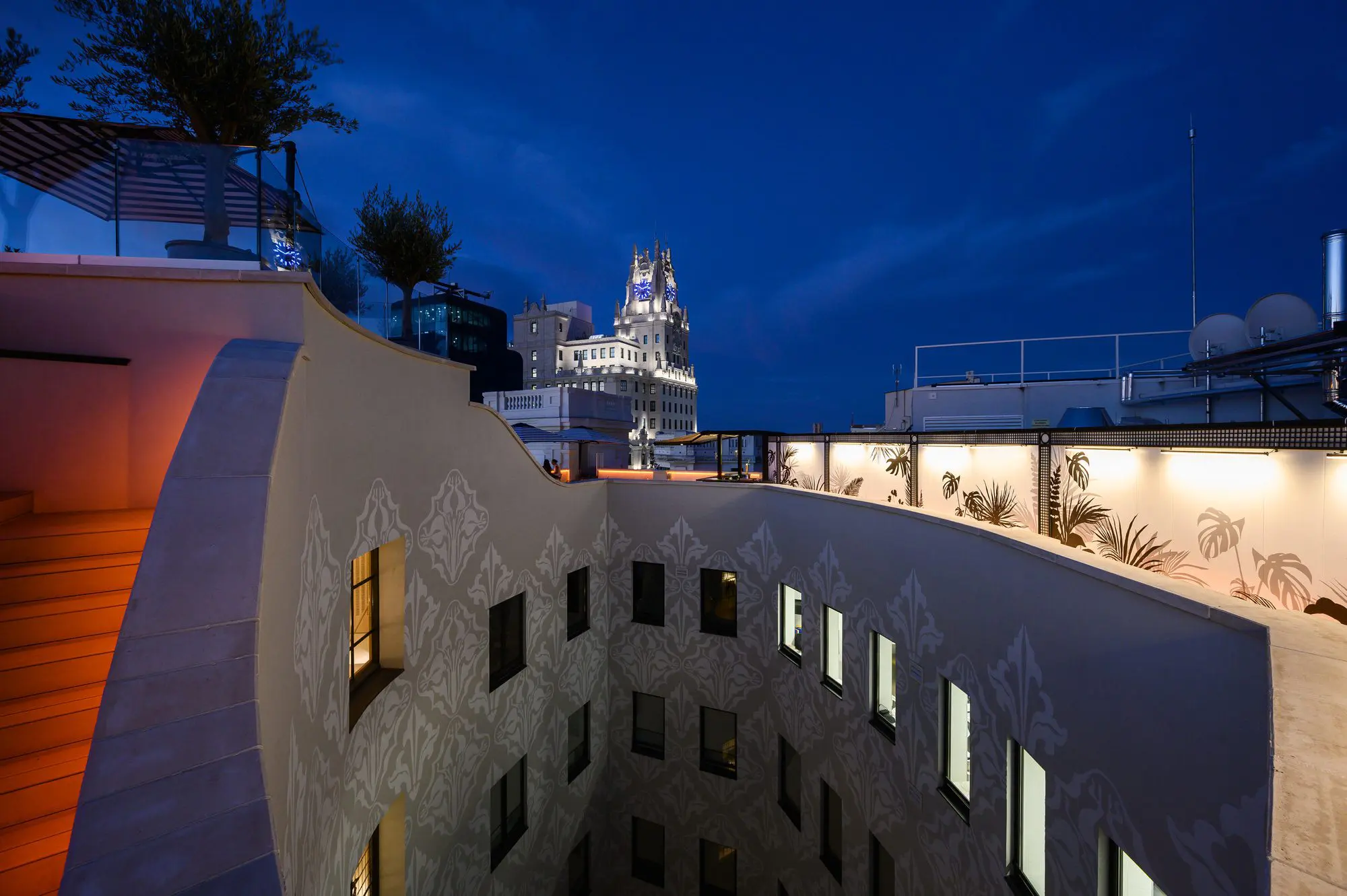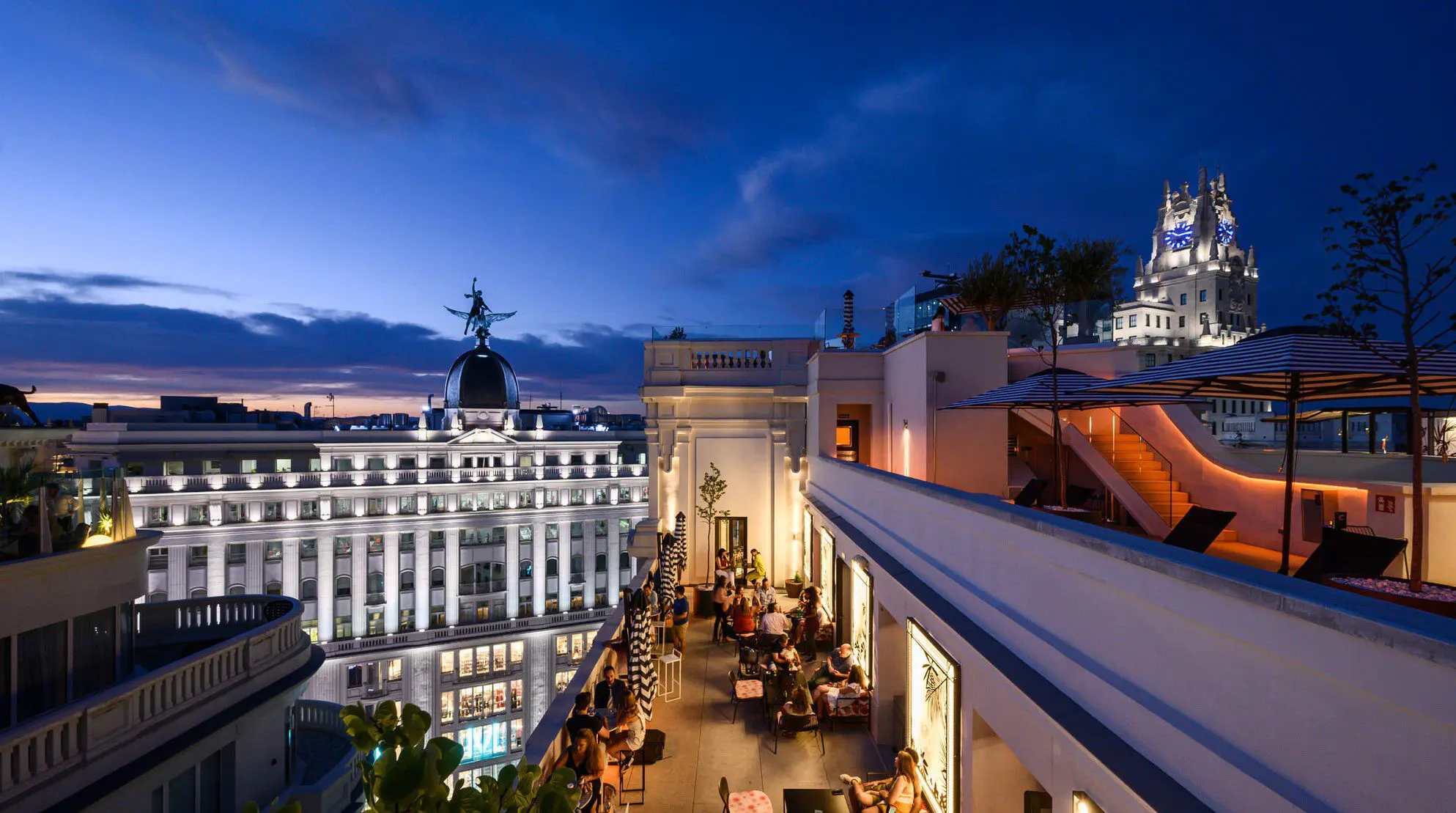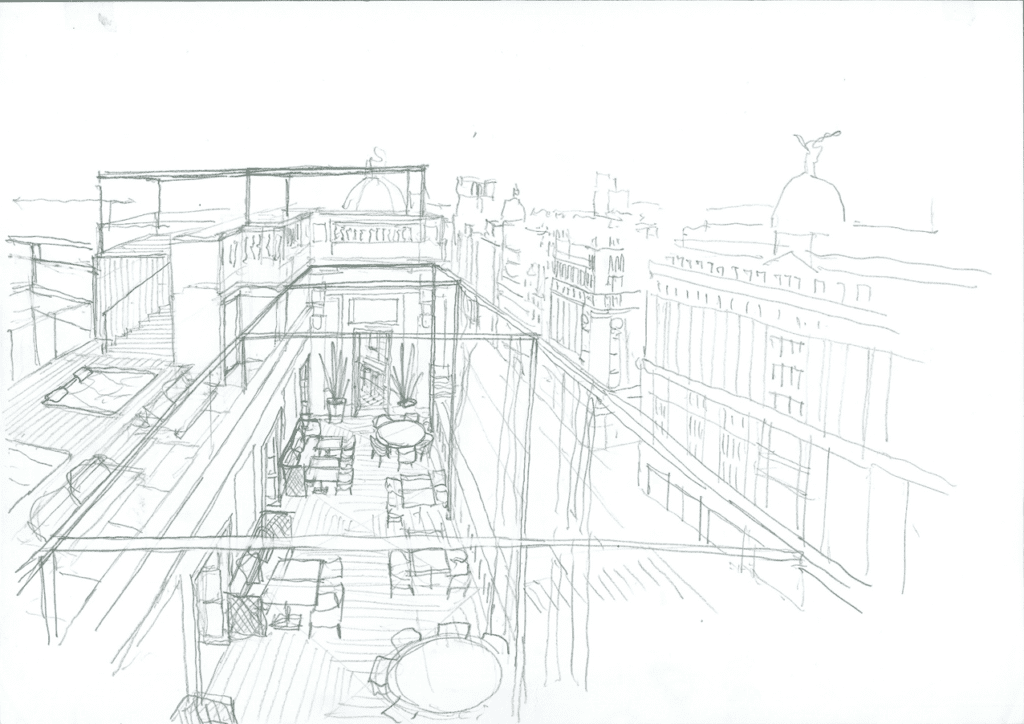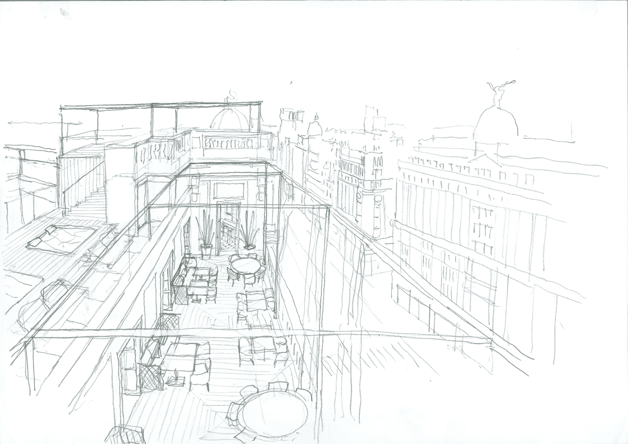 En la planta primera su recepción se vuelca a la Gran Vía, mientras que restaurantes, bares, terrazas y piscina se sitúan en la planta 9, 10 y 11 con unas impresionantes vistas de la ciudad.