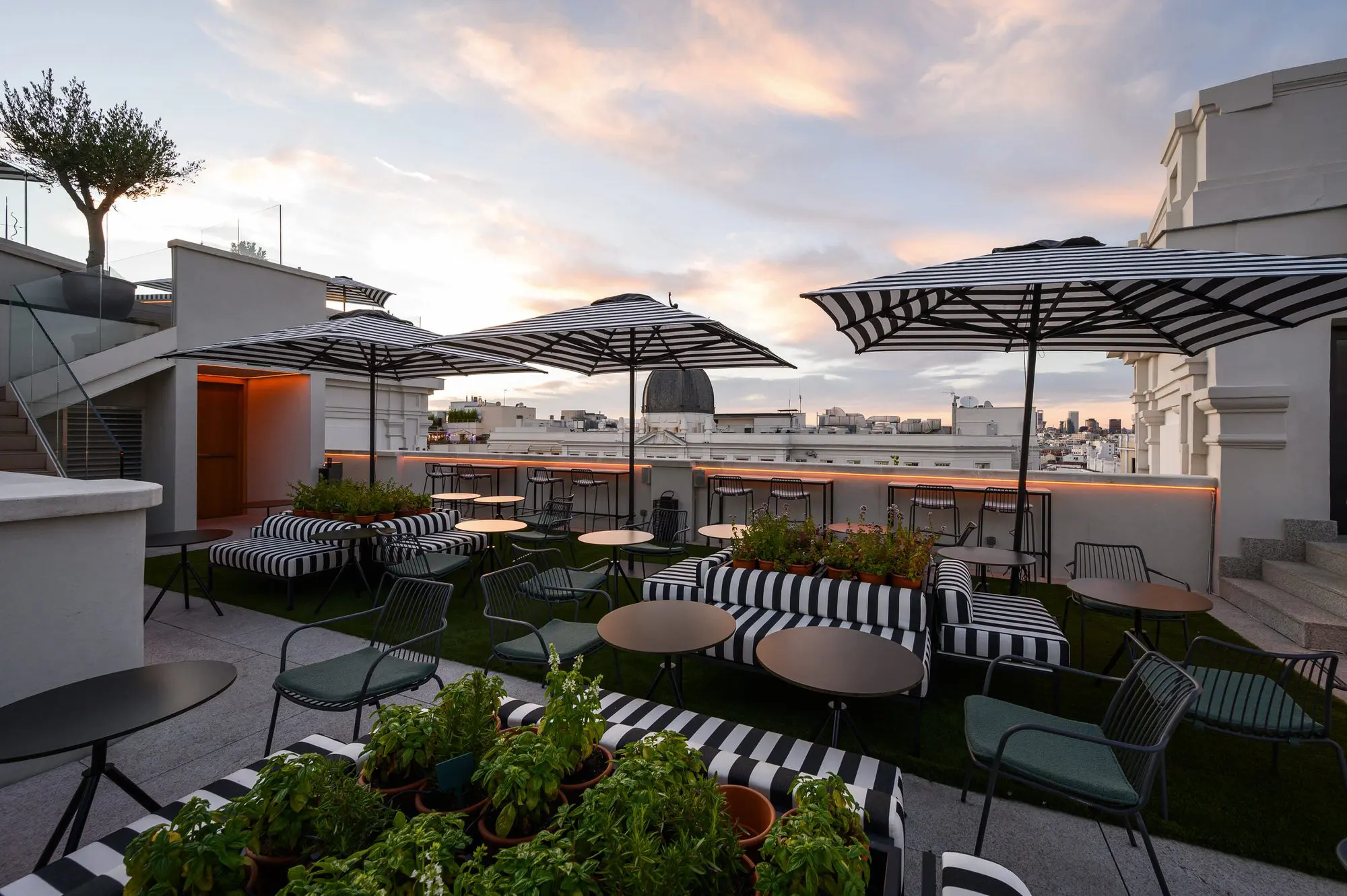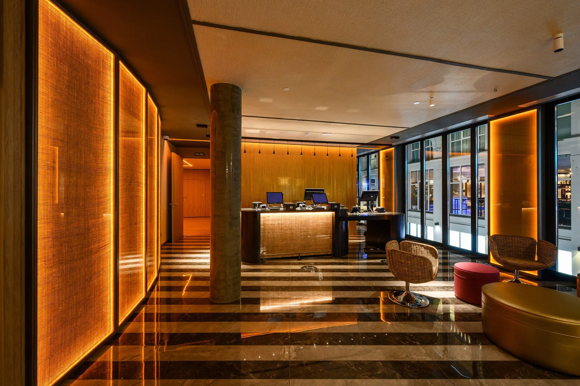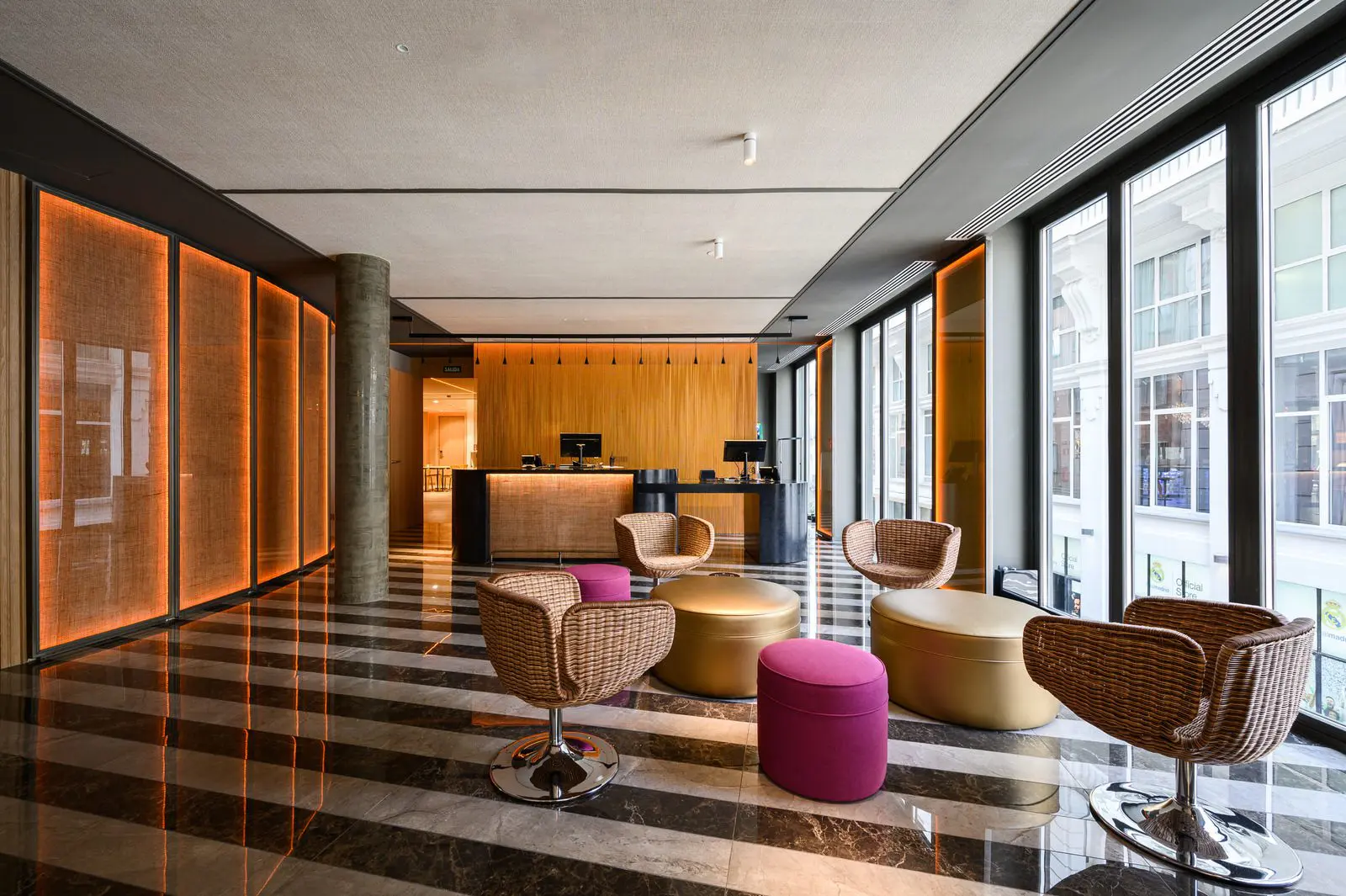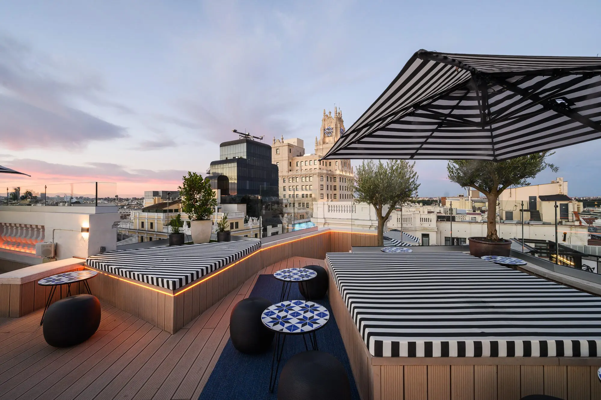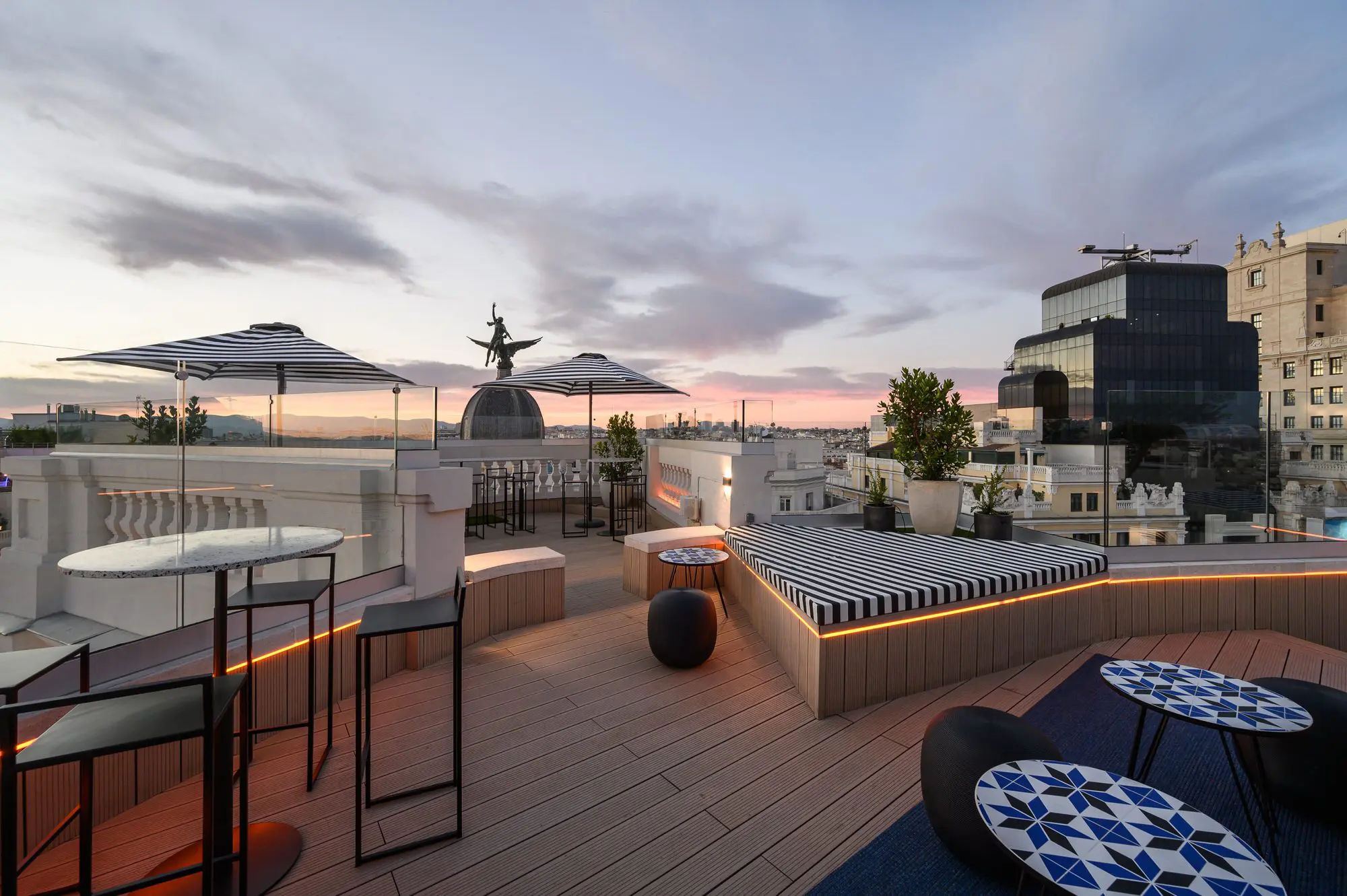 En la planta primera su recepción se vuelca a la Gran Vía, mientras que restaurantes, bares, terrazas y piscina se sitúan en la planta 9, 10 y 11 con unas impresionantes vistas de la ciudad.