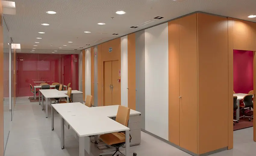 Los elementos de archivo se convierten en motivo decorativo y de organización de los diferentes ámbitos. el techo acústico de placa de cartón yeso, la iluminación y climatización se encargan de un correcto acondicionamiento del espacio de trabajo.
