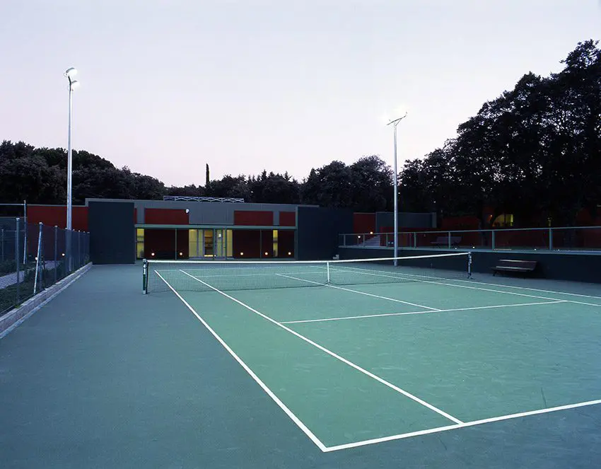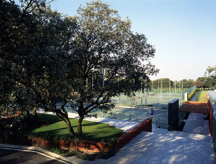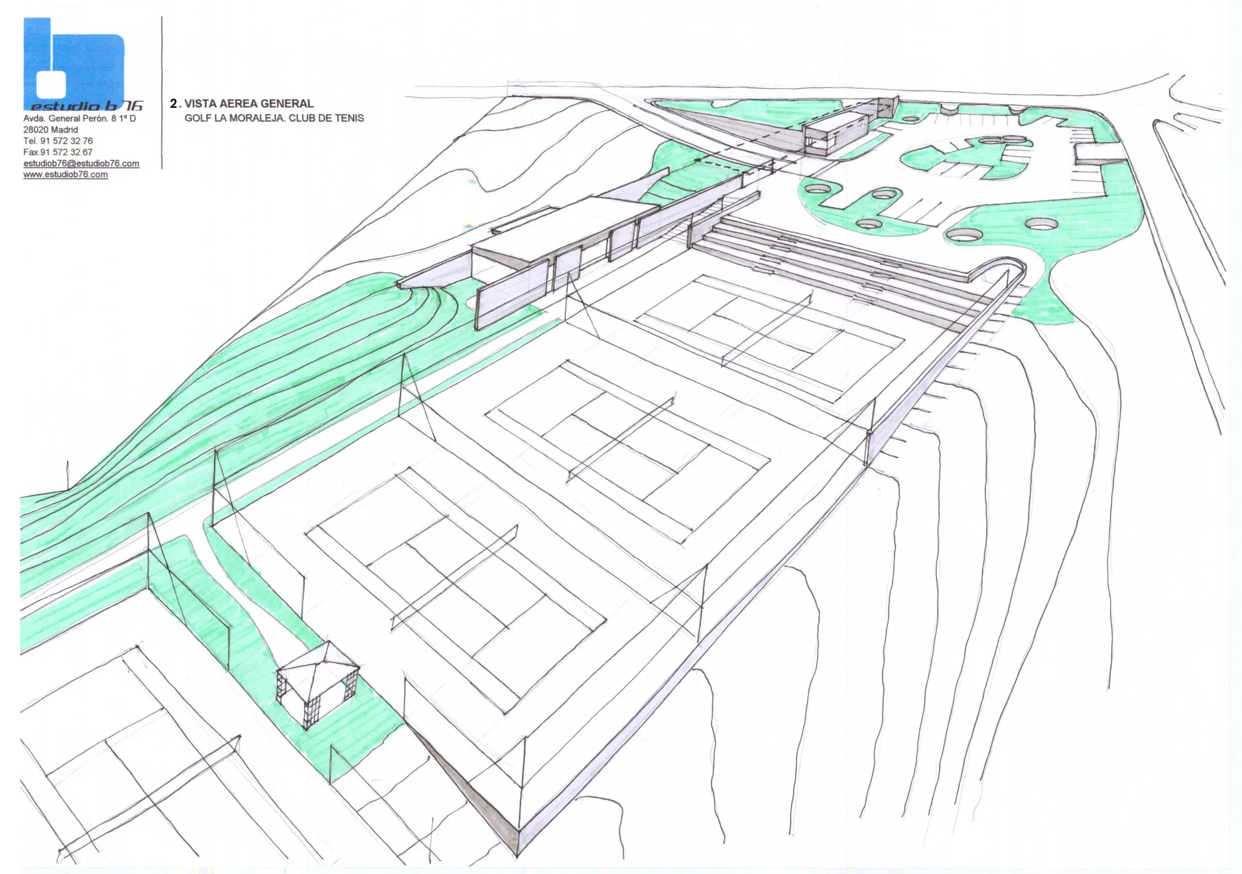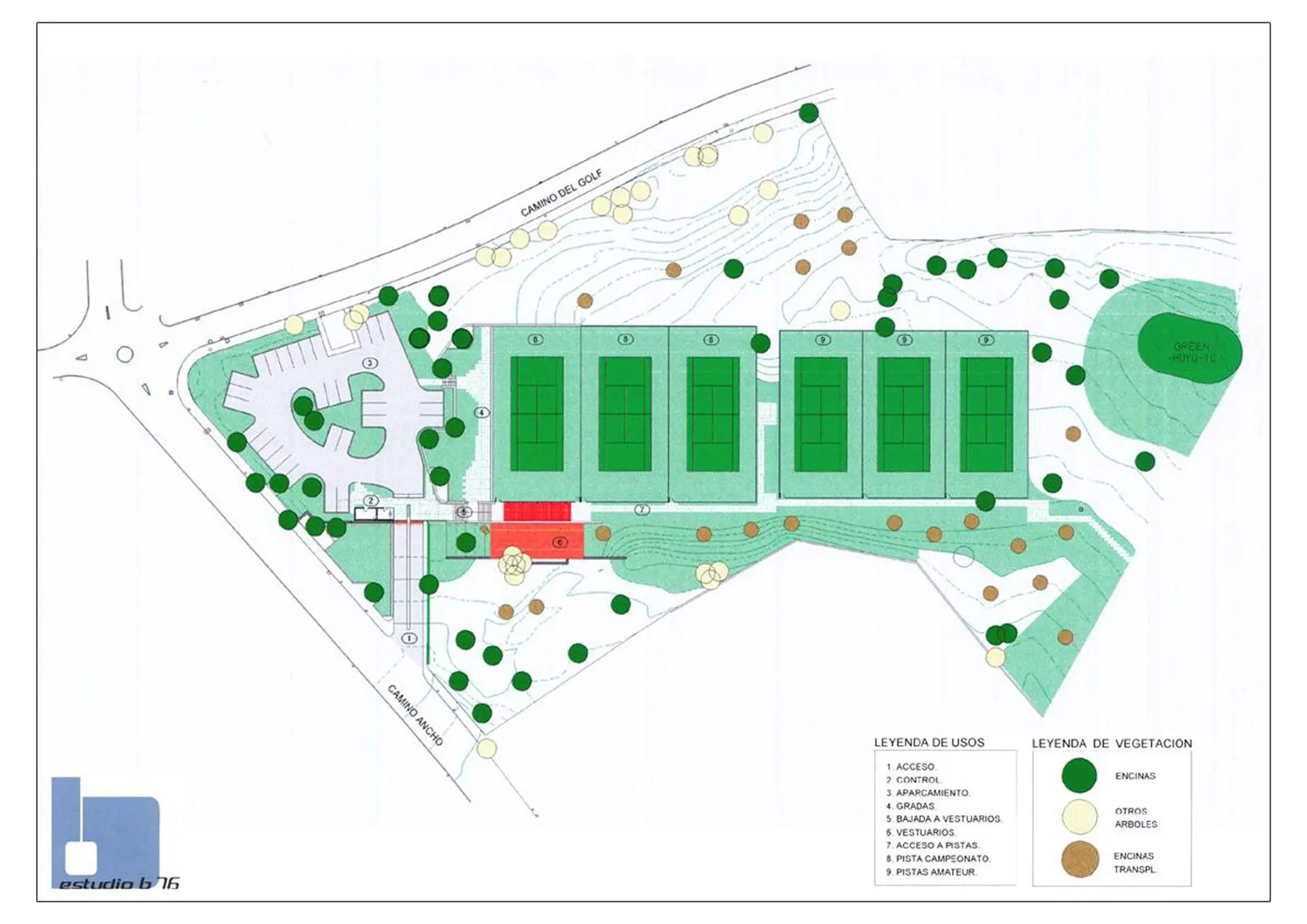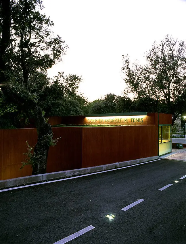 Sobre el solar, propiedad de Golf La Moraleja, situado junto al hoyo 10 del campo de golf 1 (C/ Camino ancho con C/ Camino), se proyectan las instalaciones de tenis con acceso independiente compuestas por 4 pistas de resina, 2 de césped artificial, aparcamiento y vestuarios. El proyecto se adapta a la topografía y respeta al máximo las encinas existentes. El resultado es la combinación de formas orgánicas (terreno y alcorques de las encinas) y otras lineales (muros de contención, edificación y las propias pistas de tenis.