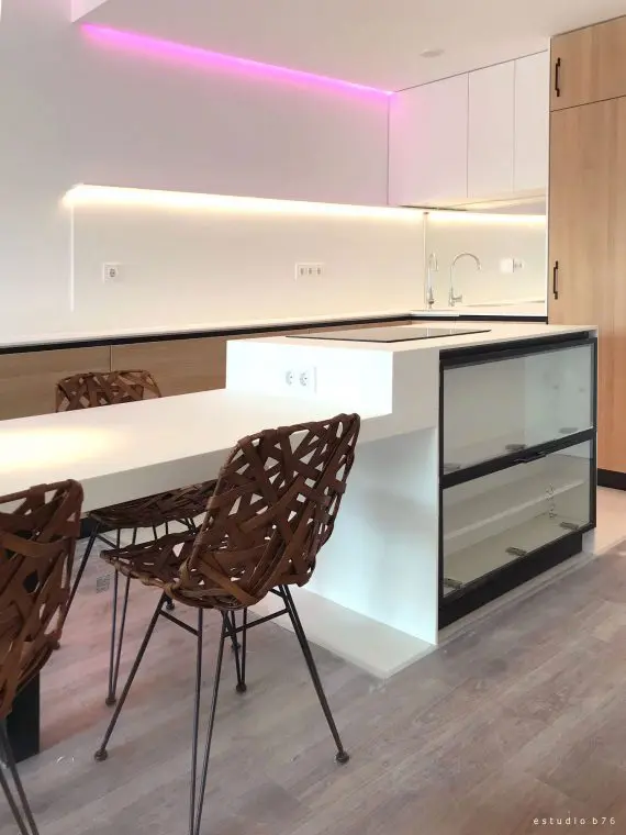 Dicho elemento se construyó con material Solid Surface de Hi-Macs, piedra acrílica termoformable, al igual que el resto de encimeras y frentes de la cocina. El mobiliario de la cocina se acabó con chapa Roble Hera de Finsa, con sistema gola y chapa de zócalo en negro.